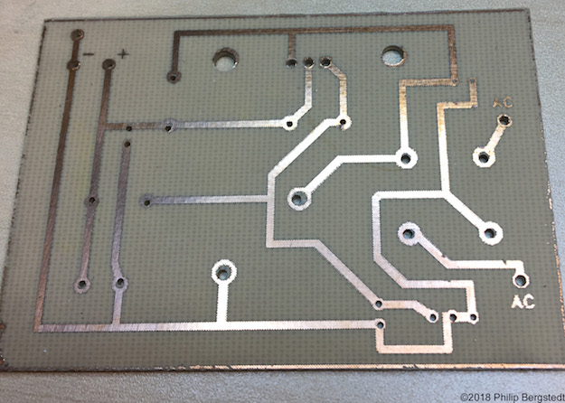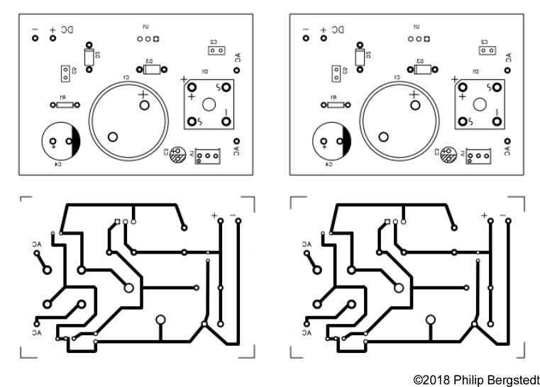 I started building my Class A amp and realized I’d need a clean, regulated 1 amp 28 volt supply. The LM317 at its upper end can do over 1A, so I decided to build the power supply around this regulator. The issue with a regulated supply is heat dissipation. The junction will produce a good amount of heat that needs to be dissipated. I started off designing the heatsink onto the power supply board. The PCB design is below.