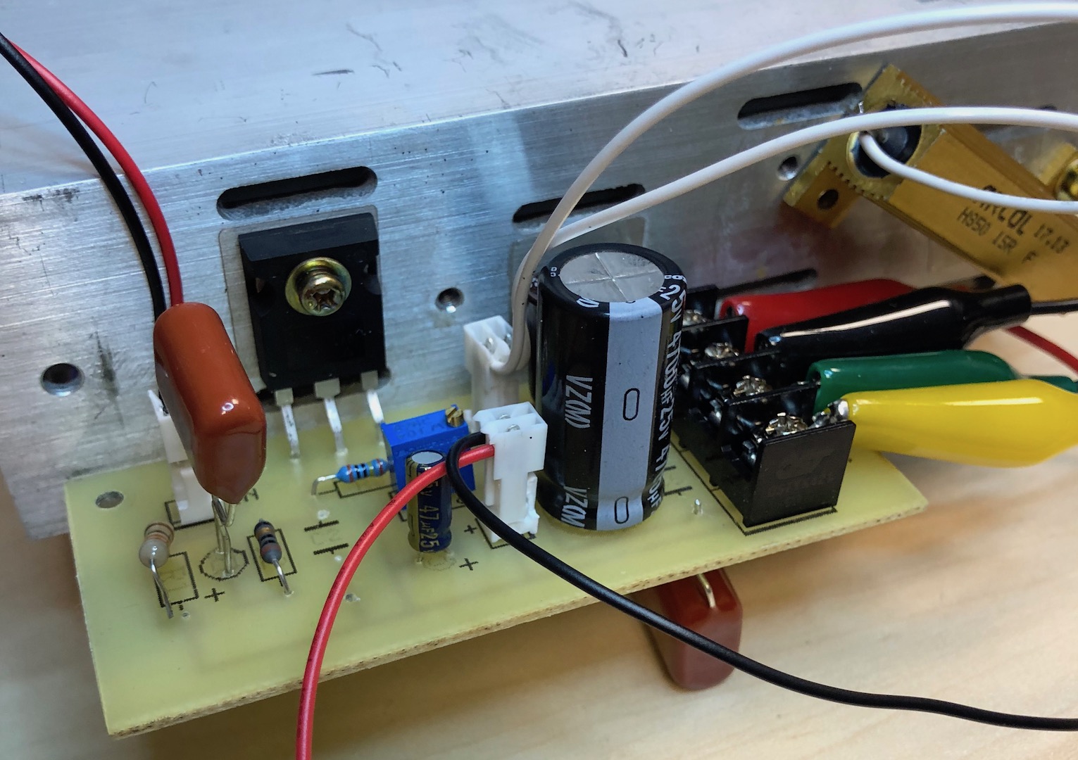 This simple MOSFET amp was fun to build and tinker with. It lacks power to be usable, but it dove my Polk Audio bench speakers (8Ω / 89dB) to a listenable level. The voltage drop / current limiting resistor (R4) does get hot, and is completely inefficient. The simplicity is what makes it intriguing, and the sound is pure and uncolorized (yes I know that’s not a word). I also discovered there is no need for the headphone amp. I was able to drive it to saturation with a standard line level (1vpp) input.